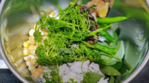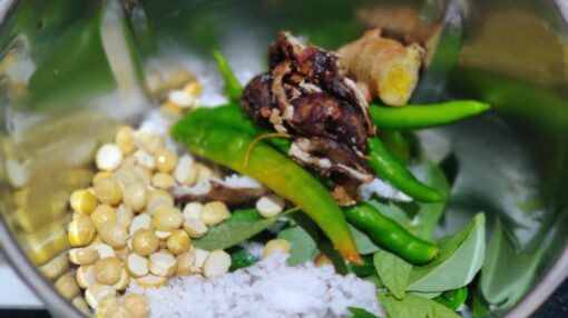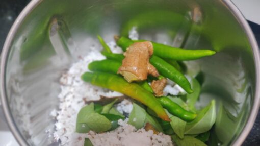 Add coconut to the mixer, 5 green chilies, ginger, and curry leaves. You can add more chillies if you prefer spicy chutney.