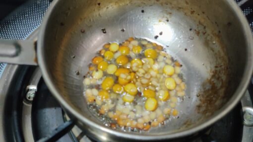 In a pan heat 1 tsp of oil, add mustard seeds, urad dal and channa dal. Once the mustard seeds start spurting, add curry leaves and turn off the flame.