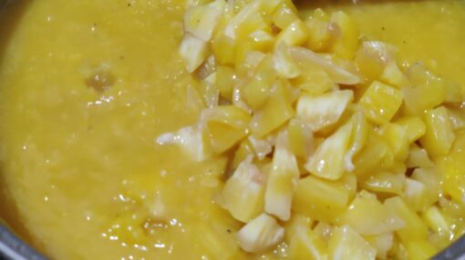 Add the jackfruit pieces to the pan and let them boil for 5 mins.